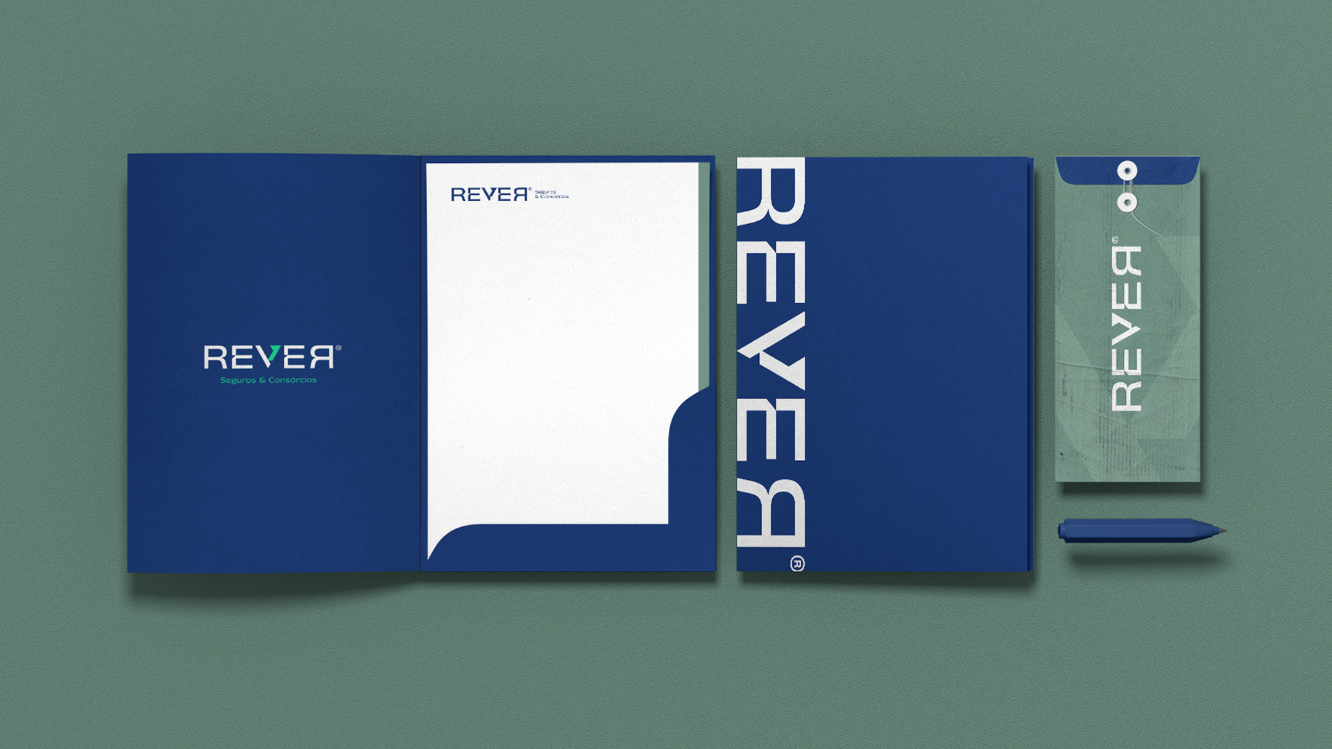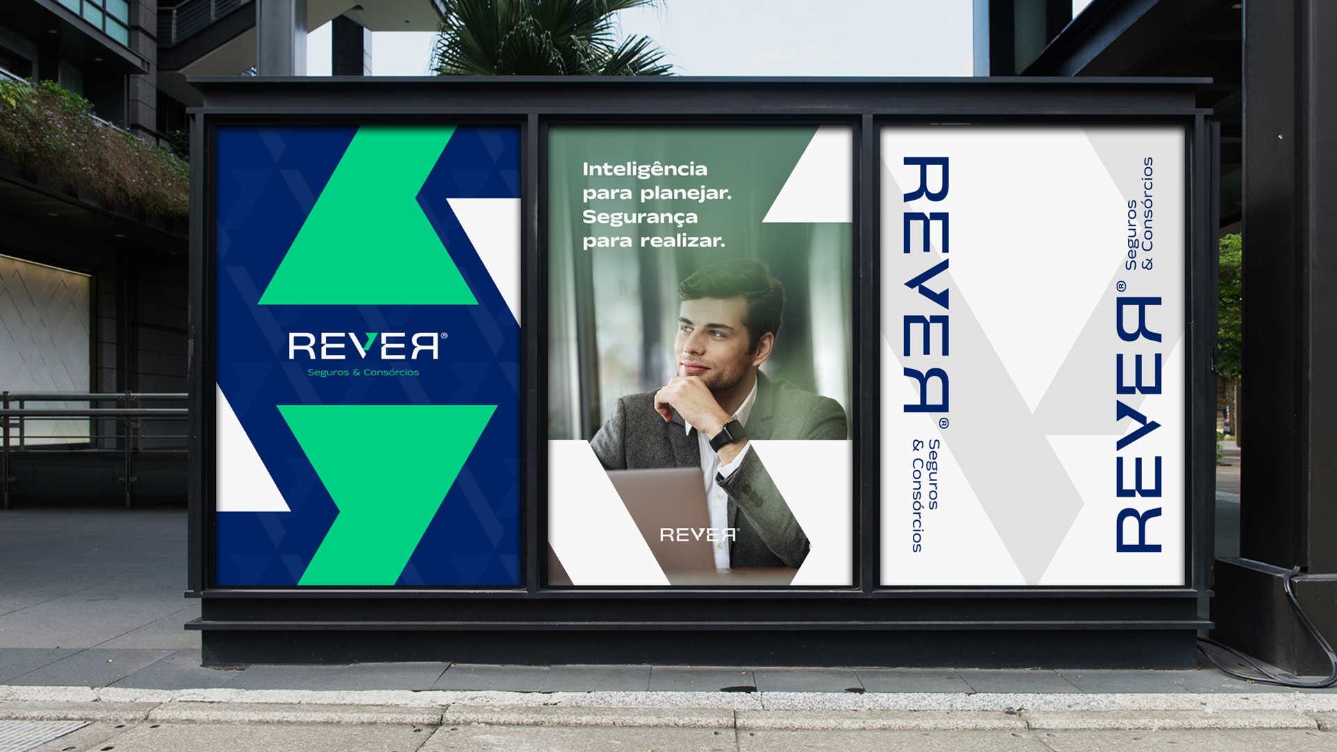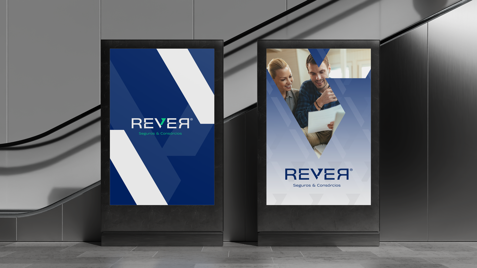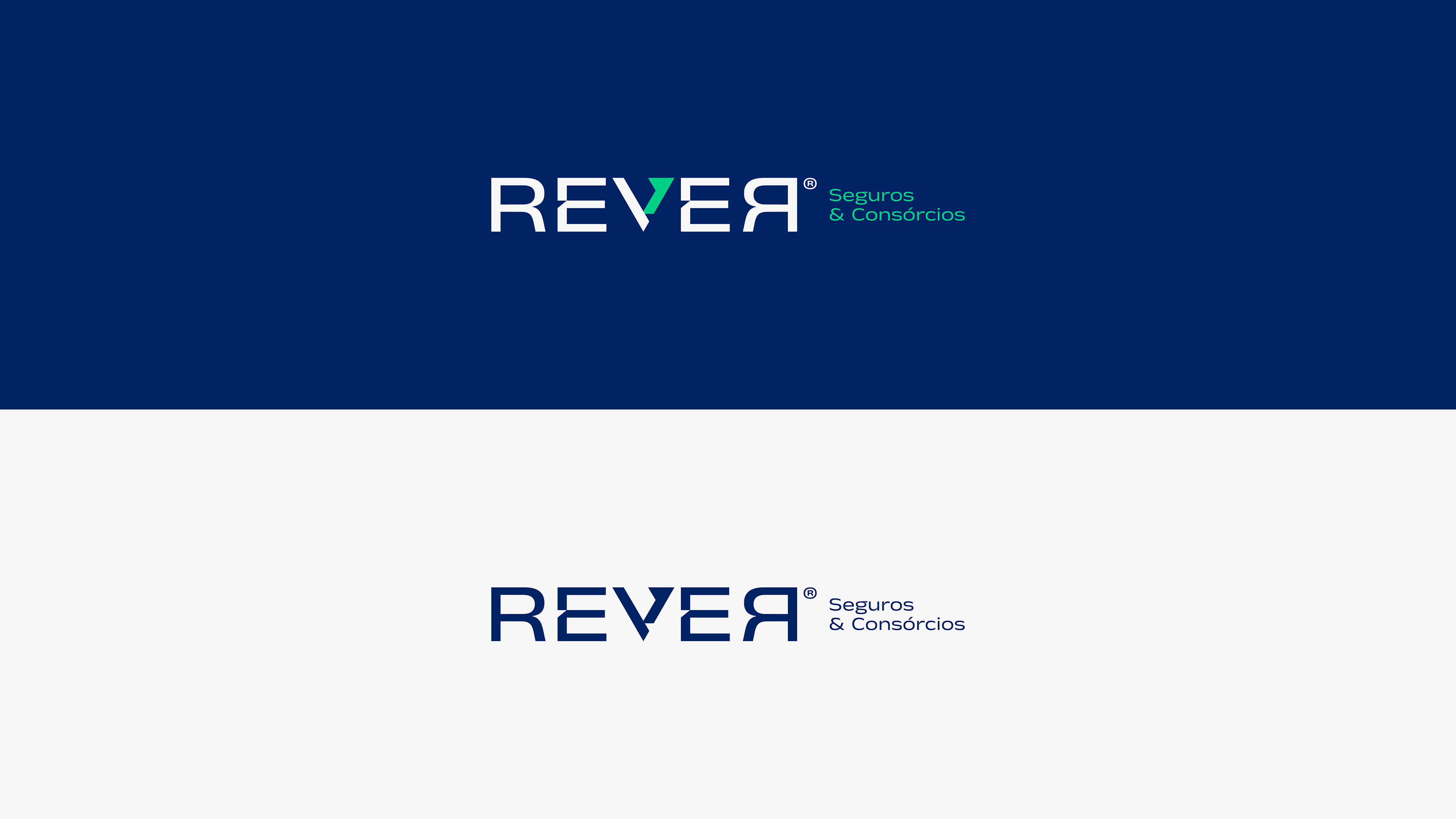 A identidade visual da REVER nasce do próprio naming, um palíndromo que representa reflexão e equilíbrio. O logotipo tipográfico explora essa leitura contínua, tendo o “V” como eixo central da marca, simbolizando validação, direção e avanço. Esse elemento também funciona como ícone independente, reforçando reconhecimento e unidade visual. Os cortes sutis nas letras remetem à análise e precisão, resultando em uma marca sólida, clara e alinhada ao território de confiança e planejamento.