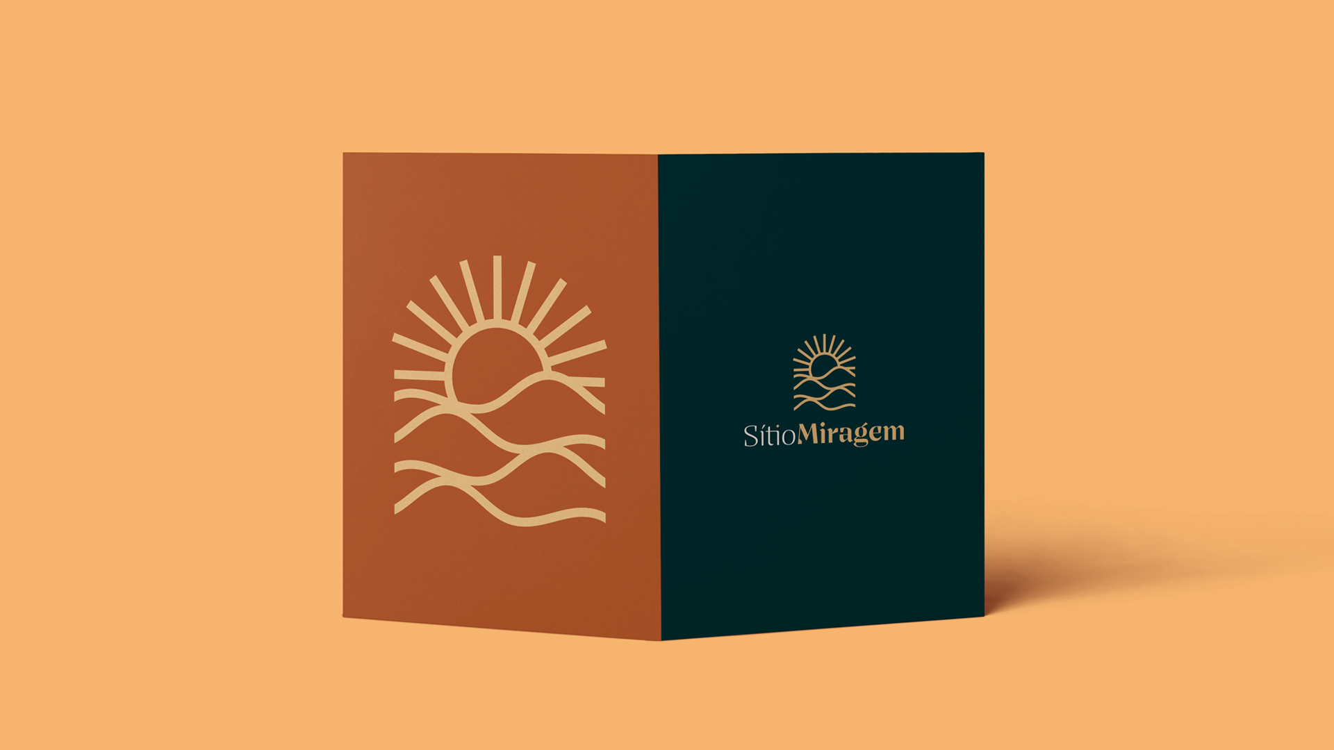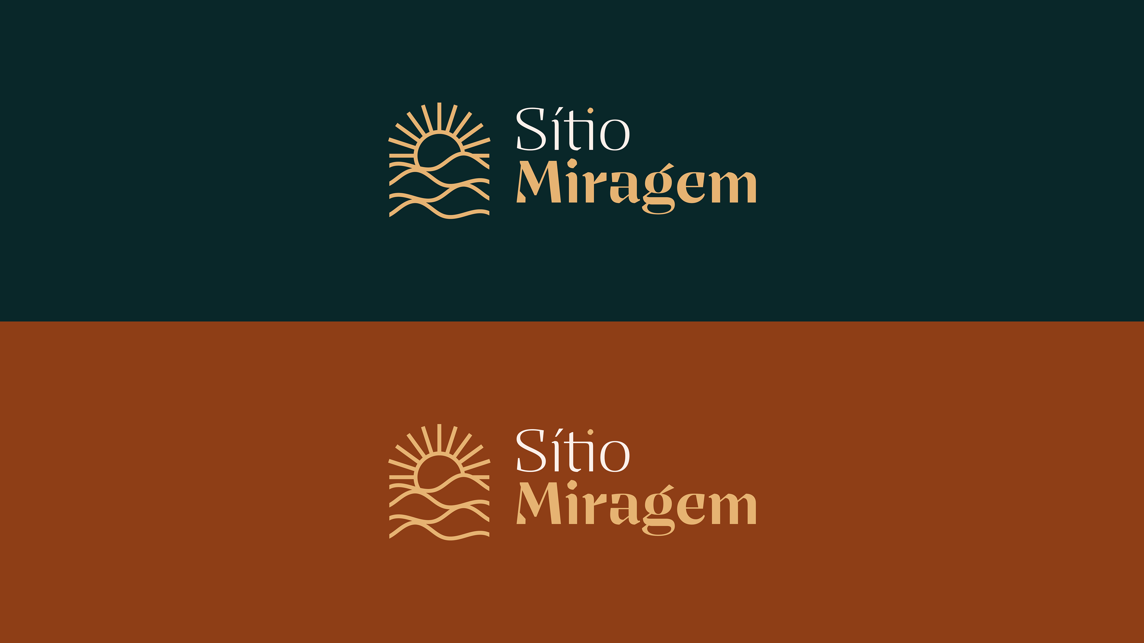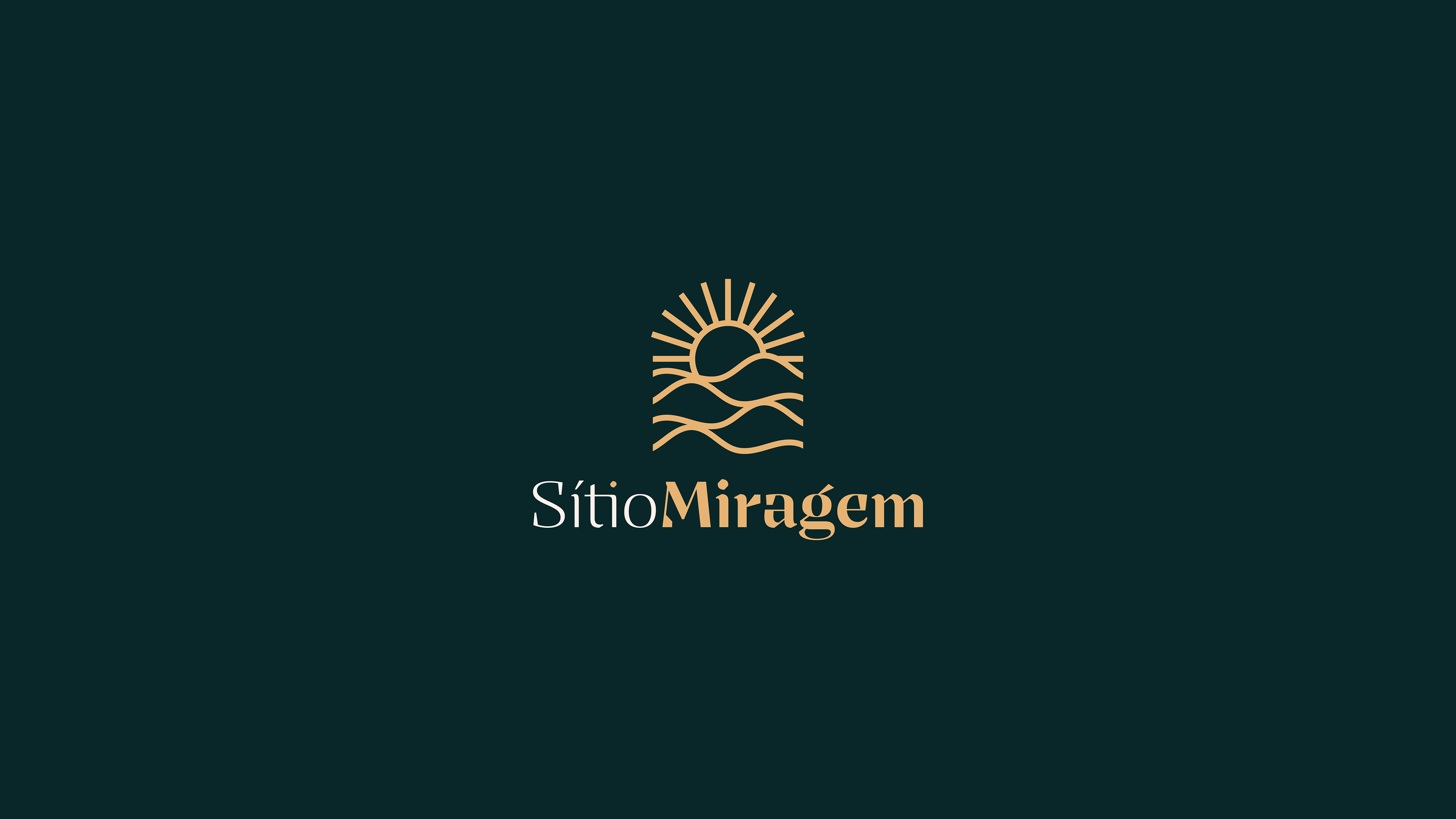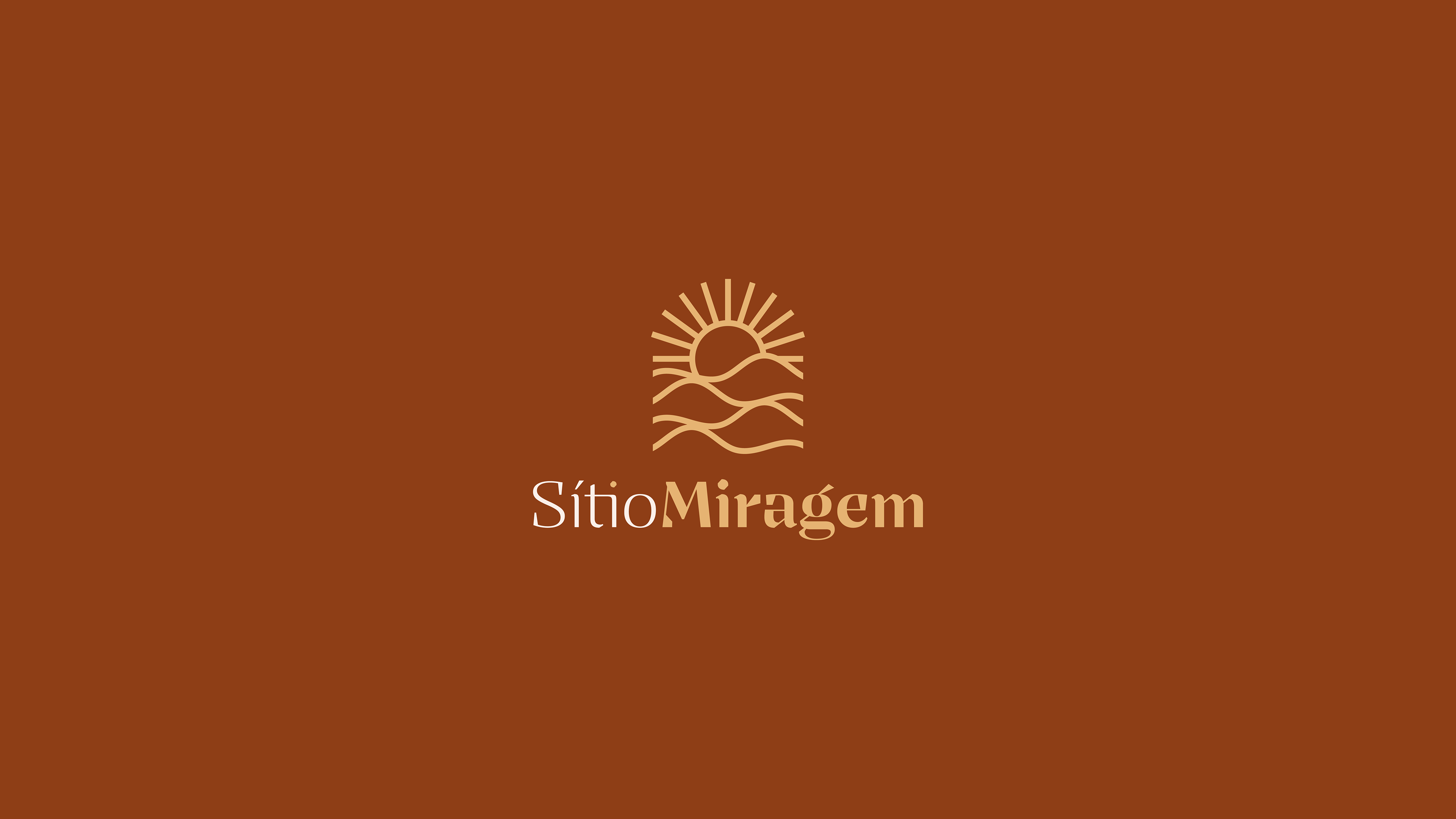 A identidade visual do Sítio Miragem combina elegância e simplicidade, refletindo o conceito que inspira o nome. O símbolo remete às ondulações da areia e ao sol ao fundo, criando a sensação de miragem em um deserto. A tipografia reforça essa ideia com formas sofisticadas e leves, resultando em um logotipo minimalista, harmônico e alinhado ao posicionamento refinado da marca.